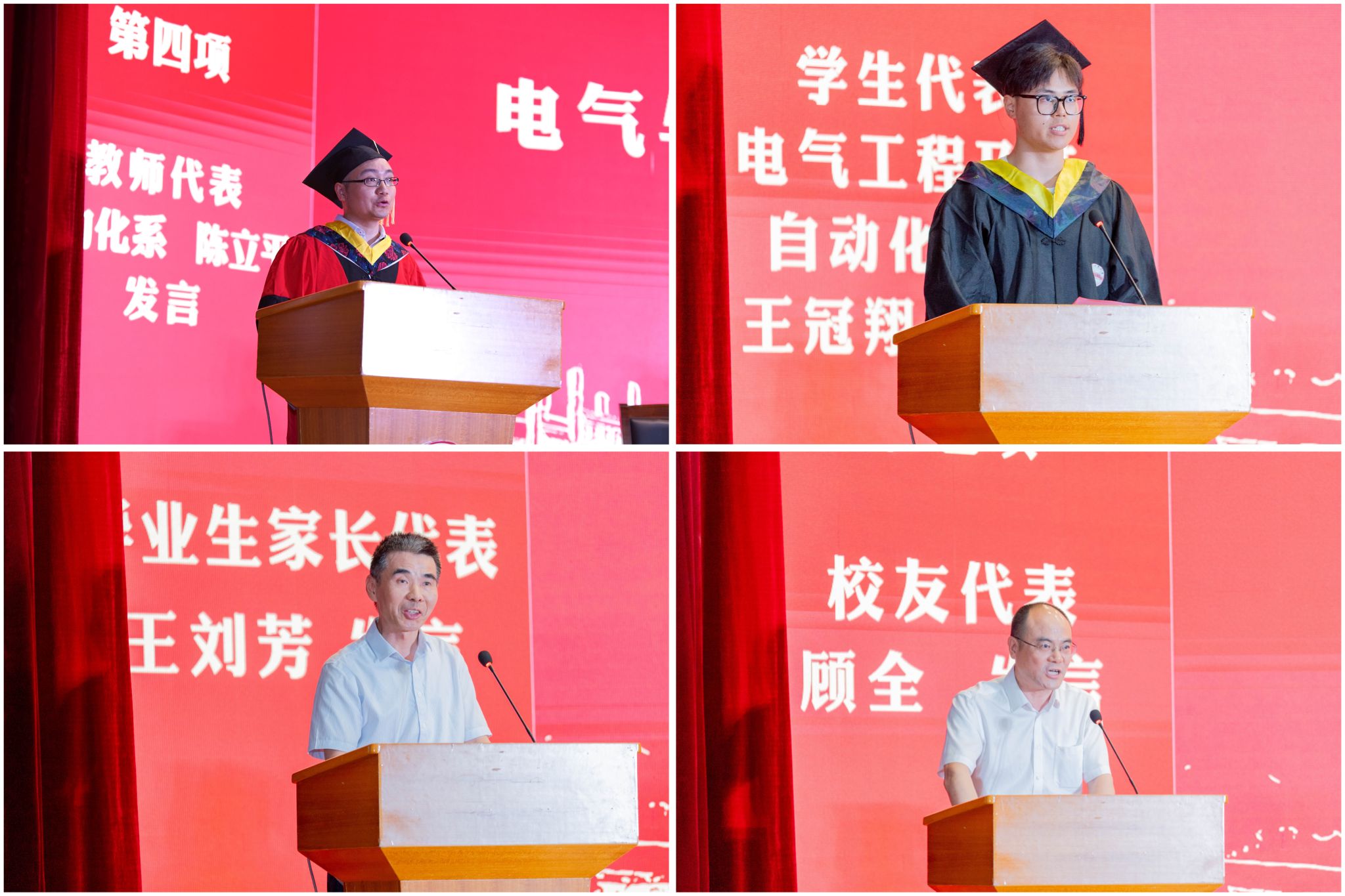 校长奖获得者、电气工程及其自动化专业2020级3班王冠翔同学作为毕业生代表发言,他深情感恩母校的培育培养,感恩老师的辛勤指导,号召广大毕业生肩负起新时代的重任,不负时代,不负韶华,成为新时代奋勇前进的搏击者,带着母校的期望、老师的教诲、朋友的鼓励,砥砺前行,以青春之名,赴时代之约。
